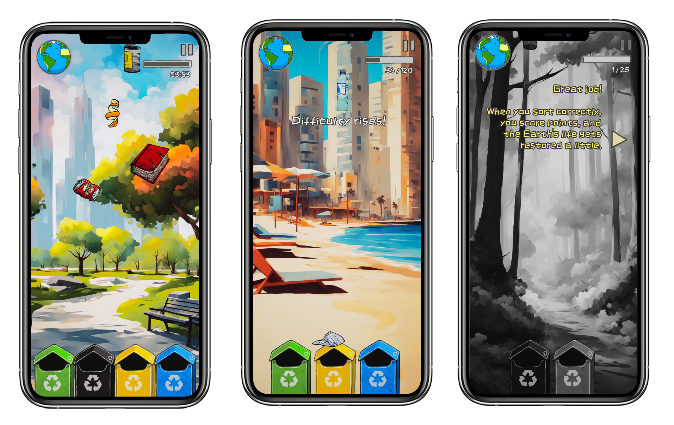Watch the Earth icon - it's your life meter! Wrong sorts and missed items damage our planet, turning green areas barren. Every correct sort heals the Earth, creating a powerful connection between your actions and environmental impact.Game Features